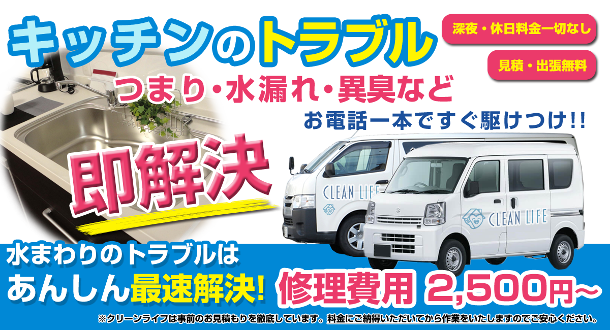 キッチンのレバーで蛇口を閉めても水がたれてくる。蛇口の取り換え、蛇口の根本から水漏れ、シンク下の水漏れ、排水溝の詰まりや異臭など、キッチン周りは北海道夕張市南清水沢地域のクリーンライフへお任せください!迅速に解決しますお見積りは全て無料です。お気軽にご相談ください。